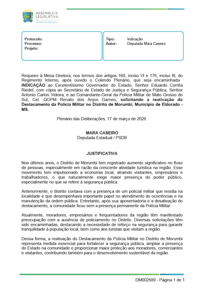 Foto: Victor Chileno | ALEMS A deputada estadual Mara Caseiro (PSDB) oficializou um pedido estratégico ao Governo de Mato Grosso do Sul para o reforço da segurança pública no Cone Sul. A indicação, direcionada ao governador Eduardo Riedel e à Secretaria de Estado de Justiça e Segurança Pública (Sejusp), solicita a reativação imediata do Destacamento da Polícia Militar no distrito de Porto Morumbi, em Eldorado.